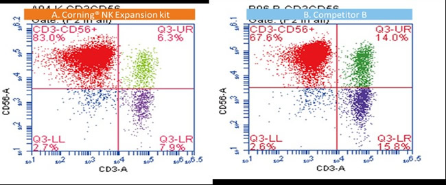 圖3. Corning培養(yǎng)基中獲得的NK細(xì)胞具有更高的CD3-CD56+陽性率 (83.0% vs 67.6%)。