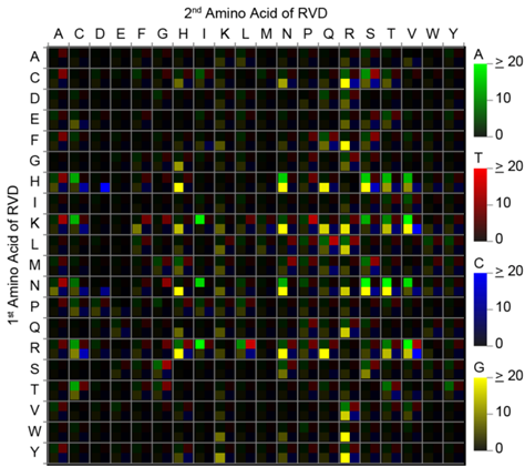 顯示TALE RVDs (Repeat-Variable Diresidues) 識別DNA堿基偏好性的熱圖 TALE (Transcription activator-like effector)是由多種黃單胞菌屬(Xanthomonas)細(xì)菌產(chǎn)生的用于激活宿主基因表達(dá)的第三類分泌蛋白。 自從2009年science同時發(fā)表了兩篇破譯TALE蛋白特異識別DNA堿基序列密碼的論文之后,TALE 的人工改造成為研究熱點(diǎn),被迅速用于真核基因的定點(diǎn)修飾中;特別是TALE核酸酶(TALENs)的發(fā)明,使得真核基因的高效定點(diǎn)敲除在多種高等生物中得以實(shí)現(xiàn)。 然而,TALE識別DNA的常用密碼來自于25個天然存在的編碼序列,其強(qiáng)度和特異性還存在不足。雖然理論上存在400種可能的編碼情況,但由于人工組裝TALE蛋白序列有較高的技術(shù)難度,人們對其他潛在密碼識別DNA堿基的偏好性仍然一無所知。 魏文勝實(shí)驗室利用自主研發(fā)的高效TALE蛋白組裝技術(shù)(ULtiMATE system)以及全新文庫構(gòu)建方法成功建立了涵蓋所有編碼可能性的TALE蛋白評估系統(tǒng),并由此獲得了全部TALE重復(fù)單元識別DNA堿基的信息。 研究結(jié)果不僅驗證了已經(jīng)發(fā)表的密碼特性,還增添了DNA序列識別的新成員以及簡并密碼,特別是發(fā)現(xiàn)了能夠更加特異地高效識別鳥嘌呤的新型雙氨基酸密碼。本研究對TALE重復(fù)單元識別DNA堿基的規(guī)律認(rèn)識以及對堿基識別的多樣性拓展,對基因定點(diǎn)修飾技術(shù)在生物工程以及精確制導(dǎo)的基因治療方面具有重要意義。 這項工作已于2月11日在線發(fā)表于《細(xì)胞研究》(Complete decoding of TAL effectors for DNA recognition),其共同第一作者為北大生命科學(xué)學(xué)院魏文勝實(shí)驗室的博士研究生楊君嬌和張媛。該項目得到了國家重點(diǎn)基礎(chǔ)研究發(fā)展計劃、國家自然科學(xué)基金和北大清華生命科學(xué)聯(lián)合中心的支持。