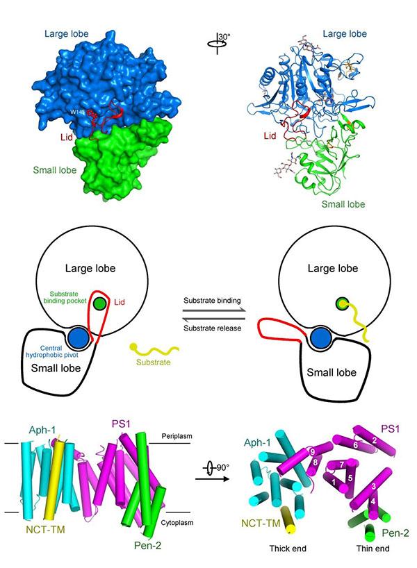 阿爾茨海默癥(老年癡呆癥)致病蛋白γ分泌酶由四個亞基組成——Presenilin (PS1), Aph-1, Pen-2和Nicastrin,其中Nicastrin被認為是γ分泌酶用來招募和識別底物的。雖然γ分泌酶具有著非常重要的功能,但是此前并沒有γ分泌酶以及它的任何一個亞基的原子分辨率的結構,這阻礙了人們對γ分泌酶的精細結構以及功能的認識。 施一公研究組首次報道了γ分泌酶的Nicastrin亞基的高分辨率晶體結構,該結構是由大小兩個裂片通過中心的疏水相互作用組裝的。底物結合區域位于大裂片上,并且該區域被來自小裂片上的一段稱為蓋子的區域覆蓋住,從而阻止了底物的進入。通過對結構的分析并結合之前的生化研究,施一公研究組提出了Nicastrin的工作模型:當有底物靠近時,Nicastrin的大小裂片會發生相對運動,從而使得蓋子區域被挪開,進而位于大裂片上的底物結合區域被暴露出來,能夠對底物進行識別。 通過該高分辨率晶體結構與此前該研究組獲得的γ分泌酶4.5埃分辨率電鏡結構比對,他們得以首次推測并確定γ分泌酶跨膜區近20個跨膜螺旋的亞基分配,揭示出與以往推測截然不同的Pen-2新型拓撲結構,從而對γ分泌酶的組裝方式以及工作機制有了新的認識。 清華大學生命科學學院在讀博士生謝田和閆創業是本文的共同第一作者,其他參與此工作的同學還有周瑞、趙艷雨、孫林峰、楊光輝、盧培龍和馬丹。本工作獲得了科技部、國家自然科學基金委、清華-北大生命科學聯合中心的經費支持。 原文摘要: Crystal structure of the γ-secretase component nicastrin Tian Xie, Chuangye Yan, Rui Zhou, Yanyu Zhao, Linfeng Sun, Guanghui Yang, Peilong Lu, Dan Ma,and Yigong Shi γ-Secretase is an intramembrane protease responsible for thegeneration of amyloid-β (Aβ) peptides. Aberrant accumulationof Aβ leads to the formation of amyloid plaques in the brain ofpatients with Alzheimer's disease. Nicastrin is the putative substrate-recruiting component of the γ-secretase complex. No atomic-resolution structure had been identified on γ-secretase or any of its four components, hindering mechanistic understanding of γ-secretase function. Here we report thecrystal structure of nicastrin from Dictyostelium purpureum at 1.95-Å resolution. The extracellular domain of nicastrincontains a large lobe and a small lobe. The large lobe ofnicastrin, thought to be responsible for substrate recognition, associates with the small lobe through a hydrophobic pivot atthe center. The putative substrate-binding pocket is shielded from the small lobe by a lid, which blocks substrate entry.These structural features suggest a working model of nicastrinfunction. Analysis of nicastrin structure provides insights intothe assembly and architecture of the γ-secretase complex.