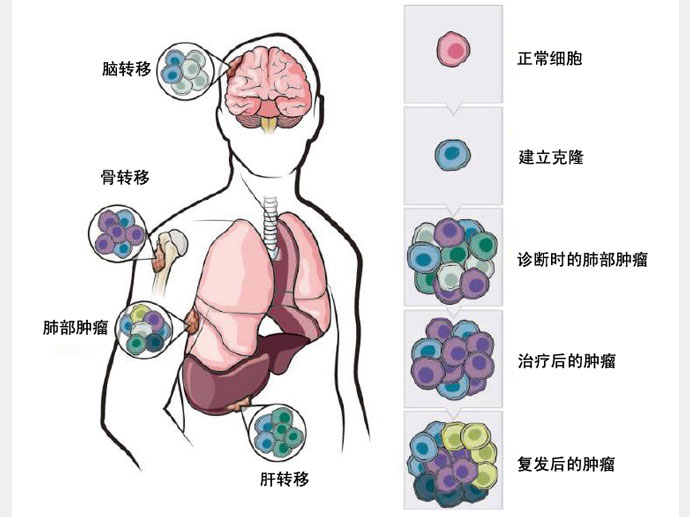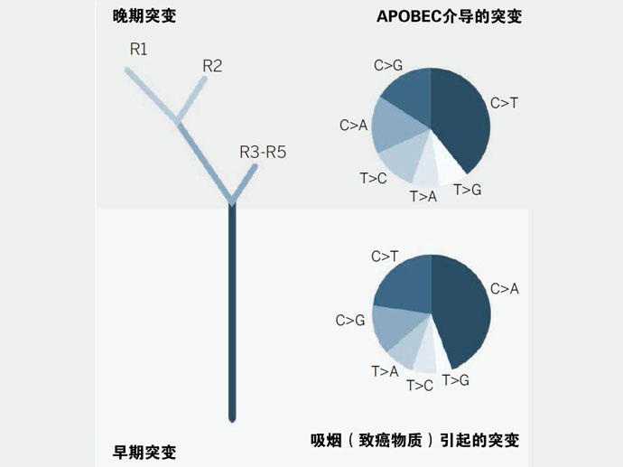 肺癌復發(fā)。該模型演示了腫瘤如何不斷獲得更加合適的克隆,產(chǎn)生亞克隆以及最終出現(xiàn)腫瘤異質(zhì)性的過程。 為何肺癌如此容易復發(fā)? 大約40年前,研究者就預測每位癌癥患者都需要得到個體化的治療,即使這樣,還是有些負隅抵抗的癌細胞會卷土重來。如今,在多種惡性腫瘤中,我們都不得不懷著沉重的心情接受這一預測的正確性。現(xiàn)在,已經(jīng)有研究證實,惡性細胞克隆及亞克隆的演化進展不僅僅通過逐漸獲得突變的方式,同時也和突然發(fā)生的災難性事件(例如大量染色體重組)有關(guān),這些都會導致腫瘤組織內(nèi)的基因組異質(zhì)性的出現(xiàn)。新一代測序技術(shù)的出現(xiàn),讓研究者可以對這些生物學過程進行前所未有的細致研究。在血液性惡性腫瘤、乳腺癌、卵巢癌、膀胱癌、胰腺癌和腎癌中都發(fā)現(xiàn)了大量的腫瘤內(nèi)異質(zhì)性現(xiàn)象。最近,Zhang及de Bruin等人帶領(lǐng)的研究小組都有了新的研究發(fā)現(xiàn),分別在自己的研究中發(fā)現(xiàn)了肺癌中普遍存在的腫瘤內(nèi)異質(zhì)性,為今后的研究奠定了重要基礎(chǔ)。 肺癌是全世界最常見的癌癥相關(guān)導致的死亡原因之一。其中,非小細胞肺癌(NSCLC)是最常見的分型,大約占新診斷肺癌病例中的85%。根據(jù)所在地區(qū)的不同,有10%-40%的NSCLC患者沒有吸煙史,多于一半的患者在診斷出肺癌數(shù)年前就已經(jīng)戒煙。大部分NSCLC患者在確診時,不是已經(jīng)發(fā)生轉(zhuǎn)移,就是在接受針對原發(fā)癌癥所進行的治療時,出現(xiàn)復發(fā),這一現(xiàn)象也說明了對該疾病進行系統(tǒng)化研究的重要性。在過去數(shù)十年里所研發(fā)使用的細胞毒性的化療方法,最終證明只能對轉(zhuǎn)移性NSCLC患者的生存率有非常一般的提高。然而,有一小部分患者(15%),腫瘤發(fā)生與編碼表皮生長因子受體(EGFR)的基因發(fā)生突變有關(guān),或者與編碼間變性淋巴瘤激酶(ALK)基因突變有關(guān),在接受特異靶向性治療后,表現(xiàn)出顯著的療效。盡管這些患者在確診數(shù)年后,最終也會出現(xiàn)腫瘤的惡性進展。全面闡明導致肺癌起始、維持、進展過程中的分子事件,對于找到提高患者預后的治療方法至關(guān)重要。 NSCLC發(fā)病與吸煙史之間的關(guān)系十分復雜,從基因組序列分析上,可以找到大量相關(guān)的單點突變、基因擴增、插入、刪除及結(jié)構(gòu)重組。相反,從非吸煙的肺癌患者所獲得的組織樣品的研究來看,所具有的突變及基因組改變就少得多。到目前為止,幾乎所有針對肺癌的基因組研究所使用的樣本,都是來自腫瘤組織的單個區(qū)域,這無疑限制了對腫瘤內(nèi)異質(zhì)性及克隆演變的了解。 腫瘤的演變可以通過線性方式,也就是逐漸獲得更加合適的克隆,最終超過現(xiàn)有克隆的速度;或者采取更加常見的分支演進方式:多個亞克隆同時存在并進展,最終獲得異質(zhì)性高度復雜的腫瘤組織。鑒別突變產(chǎn)生的關(guān)鍵“驅(qū)動者”——也就是使癌細胞具有選擇性生長優(yōu)勢的突變——在NSCLC致病中的分支點,對于尋找有效的治療方法十分重要。Zhang等人采用多區(qū)域全外顯子測序技術(shù),對11個肺腺癌樣本進行了檢測;de Bruin也使用相同的全外顯子測序手段以及/或者全基因組測序,對7個NSCLC原位腫瘤樣本中25個空間上彼此相隔的區(qū)域進行了檢測。在所有18個原位腫瘤中,腫瘤內(nèi)異質(zhì)性普遍存在。由de Bruin所進行的檢測中,大約有三分之一的非沉默突變出現(xiàn)在上述25個區(qū)域中的至少一個中,但并未出現(xiàn)在所有區(qū)域。De Bruin等人的研究結(jié)果表明,在亞克隆多樣化出現(xiàn)之前、甚至之后所出現(xiàn)的關(guān)鍵突變驅(qū)動的分支進化,有可能帶來一個我們十分不愿意看到的可能性:如果按照目前臨床上理性的做法,對腫瘤組織單個區(qū)域取樣,很有可能會漏檢在特定亞克隆內(nèi)已經(jīng)出現(xiàn)的突變。與之對應,Zhang等人從所有腫瘤樣本區(qū)域內(nèi)21個已知癌基因中鑒定出了20個。由于這兩個研究的樣本量都太小,因此無法據(jù)此得到最終的結(jié)論,因此,在目前階段,臨床上單個區(qū)域活檢的方式也還會繼續(xù)下去。盡管對高風險的轉(zhuǎn)移性病變進行多區(qū)域、多位點的活檢有利于檢出突變,但還需要信服力更強的研究結(jié)果來支持,從而從根本上改變目前的例行做法。 克隆演化。該圖中的系統(tǒng)發(fā)生樹為我們展示了肺癌的克隆演化過程。餅圖顯示了發(fā)生于腫瘤進化早期(吸煙誘導的突變)和晚期進化(APOBEC介導的)的6種類型的突變。R表示腫瘤的區(qū)域。 研究者還需要進行更多的工作,以便闡明由突變驅(qū)動的區(qū)域性占優(yōu)勢的亞克隆的比率,以及其在腫瘤轉(zhuǎn)移和藥物抗性上的作用。Zhang等人發(fā)現(xiàn)其中有三名攜帶大量亞克隆的患者在手術(shù)后出現(xiàn)復發(fā),這一發(fā)現(xiàn)需要得到進一步的關(guān)注,已確定是否可以采用腫瘤內(nèi)異質(zhì)性自身作為預后較差的生物標記。 De Bruin等人的兩個有趣發(fā)現(xiàn)表明了,與吸煙相關(guān)的基因組事件發(fā)生于疾病很早的階段,與之相伴的還包括突變驅(qū)動性因子以及單核苷酸突變。與吸煙相關(guān)的基因組加倍等事件早在曾經(jīng)有吸煙史的患