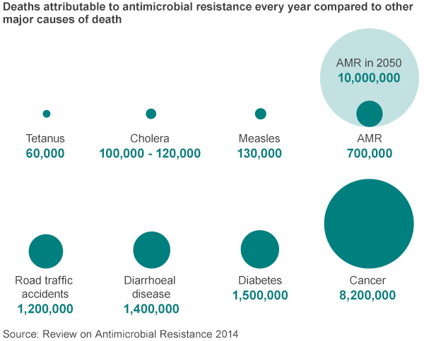 英文原文: Drug resistant infections will kill an extra 10 million people a year worldwide - more than currently die from cancer - by 2050 unless action is taken, a study says. They are currently implicated in 700,000 deaths each year. The analysis, presented by the economist Jim O'Neill, said the costs would spiral to $100tn (?63tn). He was appointed by Prime Minister David Cameron in July to head a review of antimicrobial resistance. Mr O'Neill told the BBC: "To put that in context, the annual GDP [gross domestic product] of the UK is about $3tn, so this would be the equivalent of around 35 years without the UK contribution to the global economy." The reduction in population and the impact on ill-health would reduce world economic output by between 2% and 3.5%. The analysis was based on scenarios modelled by researchers Rand Europe and auditors KPMG. They found that drug resistant E. coli, malaria and tuberculosis (TB) would have the biggest impact. In Europe and the United States, antimicrobial resistance causes at least 50,000 deaths each year, they said. And left unchecked, deaths would rise more than 10-fold by 2050. Graph Mr O'Neill is best known for his economic analysis of developing nations and their growing importance in global trade. He coined the acronyms Bric (Brazil, Russia, India and China) and more recently Mint (Mexico, Indonesia, Nigeria and Turkey). He said the impact of the would be mostly keenly felt in these countries. "In Nigeria, by 2050, more than one in four deaths would be attributable to drug resistant infections, while India would see an additional two million lives lost every year." Global map of deaths The review team believes its analysis represents a significant underestimate of the potential impact of failing to tackle drug resistance, as it did not include the effects on healthcare of a world in which antibiotics no longer worked. Joint replacements, Caesarean sections, chemotherapy and transplant surgery are among many treatments that depend on antibiotics being available to prevent infections. The review team estimates that Caesarean sections currently contribute 2% to world GDP, joint replacements 0.65%, cancer drugs 0.75% and organ transplants 0.1%. This is based on the number of lives saved, and ill-health prevented in people of working age. Without effective antibiotics, these procedures would become much riskier and in many cases impossible. The review team concludes that this would cost a further $100tn by 2050. Mr O'Neill said his team would now be exploring what action could be taken to avert this looming crisis. This would include looking at: o how drug use could be changed to reduce the rise of resistance o how to boost the development of new drugs o the need for coherent international action concerning drug use in humans and animals Mr O'Neill said the support of the Bric and Mint nations was vital. He noted that China would be hosting the G20 summit in 2016 and said he hoped this issue would be a focus of discussion. 'Compelling' He said scientists seemed more certain that drug resistance would be a major problem in the short term, than they were over climate change. Dr Jeremy Farrar, the director the Wellcome Trust, said: "By highlighting the vast financial and human costs that unchecked drug resistance will have, this important research underlines that this is not just a medical problem, but an economic and social one too." Prof Dame Sally Davies, chief medical officer for England, said: "This is a compelling piece of work, which takes us a step forward in understanding the true gravity of the threat." The review team concludes that solving the problem of drug resistance will be far cheaper than doing nothing and there was "cause for optimism" that the right steps could be taken. This included university researchers and biotech entrepreneurs "teeming with ideas" including new drugs, vaccines and alternative therapies such as antibodies. Investment Laura Piddock, professor of microbiology at the University of Birmingham, is focusing her research on bacteria such as E. coli and salmonella, which are responsible for a growing level of drug resistant infections. Both are so-called gram-negative bacteria, which have a complex cell wall that acts as a barrier to drugs. If they do penetrate the wall, they are "vacuumed out" by the cell. She said: "My team is looking at what are the switches in those bacteria which turn that vacuum cleaner off, and at molecules which would have the same effect. If we can do that, we can make the bacteria sensitive to antibiotics." Prof Piddock said there had not been enough global investment in finding new drugs. She said: "It is very difficult to find drugs against bacteria like E.coli because they are so naturally resistant. "We need more investment and new business models to ensure the pipeline is filled with promising molecules, to ensure that we can solve this problem, and make sure the drugs are there when patients need them."