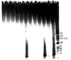 2.4.2.1電泳 取TRAP產物30 m l及標準分子量(PBR322DNA/HaeIII)1 m g,分別與適量加樣緩沖液混合上樣進行12%的聚丙烯酰胺凝膠電泳,電壓200 V,恒壓電泳4 h。