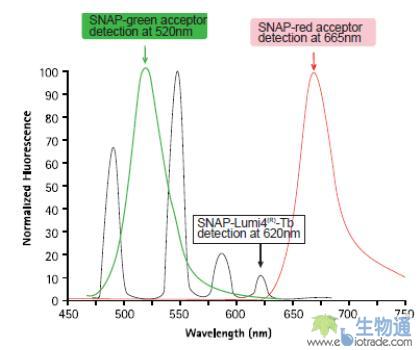Tag-lite技術利用Tb作為能量供體,其發射光譜見圖3。從圖中我們可以看出,綠色或紅色熒光都可以作為Tb的能量受體。這樣一種組合,能夠提供更高的信噪比,原因如下:1)Tb穴狀化合物具有較長的生命周期,可以時間分辨熒光的模式檢測。在這種模式下,所有的自發熒光都不會被檢測到;2)作為能量供體的Tb,在520 nm和665 nm的發射信號非常低,而這正是能量受體的檢測波長,所以來自Tb的干擾很小。
