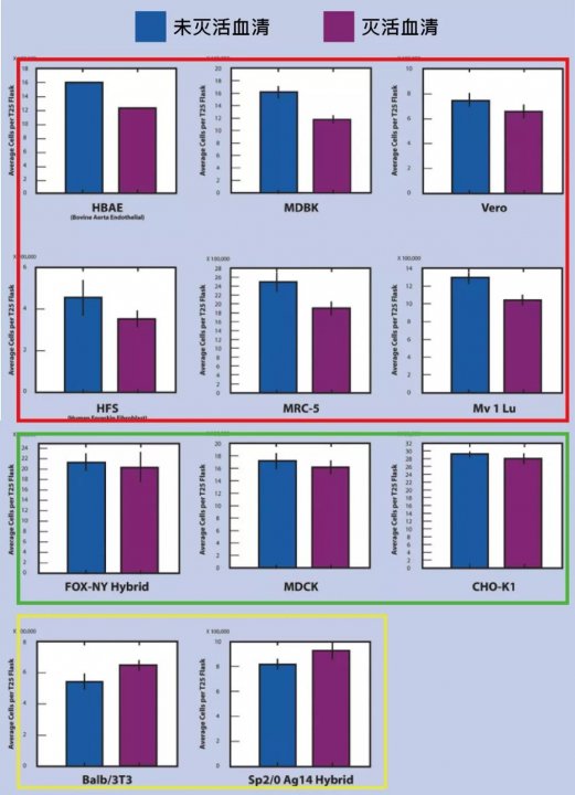細胞生物學家比較了正常熱滅活胎牛血清對各種細胞株的生長能力影響,發現11株細胞中,熱滅活對6 株細胞有負面影響(紅)、3株無影響(綠)、2株有微弱正面改善(黃)(下圖1)。