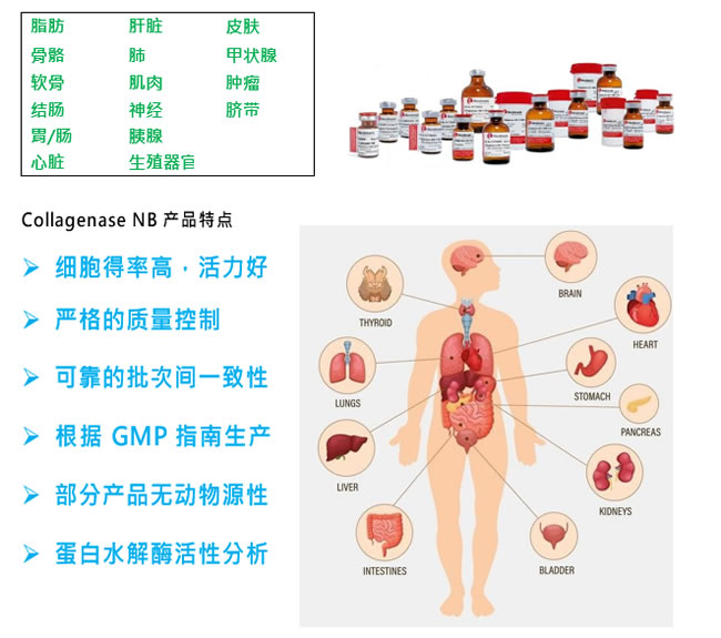 Collagenase NB 是德國 Nordmark 制藥公司提供的高品質膠原酶 NB 產品系列,特別適用于從各種組織中分離細胞。嚴格的生產標準確保了可靠的批次間一致性和卓越的性能。膠原酶 NB 系列是旨在獲得高產活細胞的研究人員的首選。組織消化酶是組織工程和人體移植的關鍵原材料。以下列舉了使用 Nordmark 膠原酶 NB 產品成功分離的器官和組織: