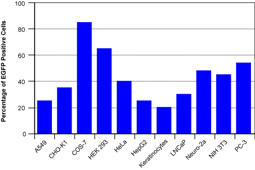 廣譜、低毒的 DNA 轉染試劑 特性 · 性能與 FuGENE® 6 試劑相當,但成本更低廉。 · 廣譜 DNA 傳遞 - 一種轉染試劑和實驗方案,可用于各種細胞。 · 低細胞毒性 - 維持細胞密度并減少實驗偏差。 · 高效遞送 - 在大量細胞中實現表達以獲得實驗成功。 · 傳遞單個或多個質粒 - 適用于許多應用,如基因表達、siRNA/shRNA 表達、病毒生產和啟動子分析。 · 提供免費樣品 描述 · TransIT®-LT (低毒性)轉染試劑為通過轉染細胞內遞送 DNA 提供了明顯的優勢,包括易用性,轉染重現性和最先進的轉染效率以及顯著降低的細胞損傷水平。此外,使用 TransIT®-LT1 進行轉染不需要更換培養基,可以在含有血清的培養基中進行。這種獨特的特性組合使這些轉染試劑成為所有基因表達研究的理想選擇,其中細胞轉染后的狀態都很重要。 TransIT®-LT1 試劑能高效地將 DNA 傳遞到多種細胞系。