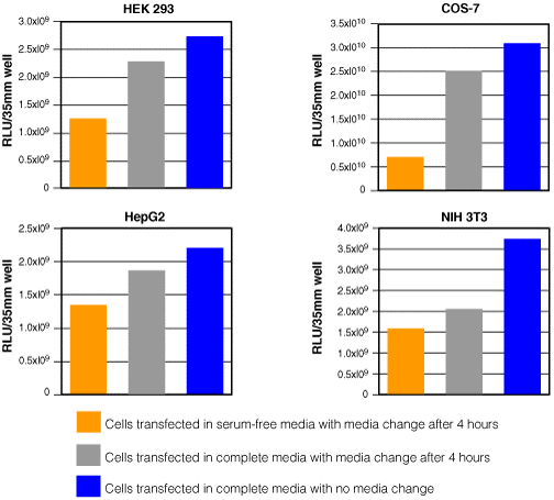 TransIT®-LT1 試劑在含有血清的培養基中表現最佳。使用 TransIT®-LT1 試劑,使用三種不同培養基條件用熒光素酶表達載體轉染指定的細胞系:在 (1) 無血清培養基存在下轉染細胞或 (2) 培養基更換 4 小時的完全培養基轉染后,或在 (3) 完全培養基存在下轉染,轉染后沒有培養基更換。轉染 48 小時后收集細胞,測定每孔熒光素酶的總活性。