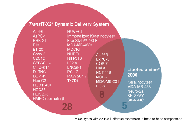 用于遞送質(zhì)粒 DNA,siRNA/miRNA 和 CRISPR/Cas9 組分的先進(jìn)系統(tǒng) 特性 · 效率 - 卓越的廣譜轉(zhuǎn)染 · 多功能性 - 質(zhì)粒 DNA 和小 RNA 的前沿傳遞(siRNA、miRNA 和 CRISPR 指導(dǎo) RNA) · 技術(shù) - 新穎非脂質(zhì)體聚合物傳遞 描述 體驗轉(zhuǎn)染突破性進(jìn)展。通過創(chuàng)新的聚合物系統(tǒng)實現(xiàn)卓越的轉(zhuǎn)染,該系統(tǒng)可有效地將 DNA 和 RNA 從內(nèi)體輸送到細(xì)胞質(zhì)中,克服核酸輸送的關(guān)鍵障礙。 TransIT-X2® 動態(tài)傳遞系統(tǒng)是一種先進(jìn)的非脂質(zhì)體聚合物系統(tǒng),能夠高效轉(zhuǎn)染多種細(xì)胞類型,包括原代細(xì)胞。TransIT-X2® 可用于 DNA 遞送、siRNA 遞送或同時遞送 DNA 和 siRNA。TransIT-X2® 的轉(zhuǎn)染不需要更換培養(yǎng)基,可在含血清的培養(yǎng)基中進(jìn)行。 TransIT-X2® 系統(tǒng)可在多種細(xì)胞類型中實現(xiàn)卓越的基因表達(dá) 使用TransIT-X2® 動態(tài)遞送系統(tǒng)和 Lipofectamine® 2000 轉(zhuǎn)染試劑將編碼熒光素酶的質(zhì)粒 DNA 以三種試劑與 DNA 比率轉(zhuǎn)染到 41 種不同的細(xì)胞類型中。使用標(biāo)準(zhǔn)熒光素酶檢測比較轉(zhuǎn)染后 24 小時熒光素酶的表達(dá)。在優(yōu)化的比例下進(jìn)行的頭對頭比較表明使用 TransIT-X2® 在 41 種細(xì)胞類型中的 36 種中表現(xiàn)出優(yōu)異或相等的熒光素酶表達(dá);表達(dá)水平高 2 倍的 17 種細(xì)胞類型用 ‡ 表示。