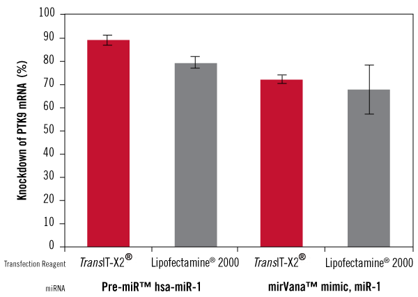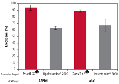 TransIT-X2® 動態(tài)傳遞統(tǒng)比 Lipofectamine® 2000 具有更高的擊倒率。