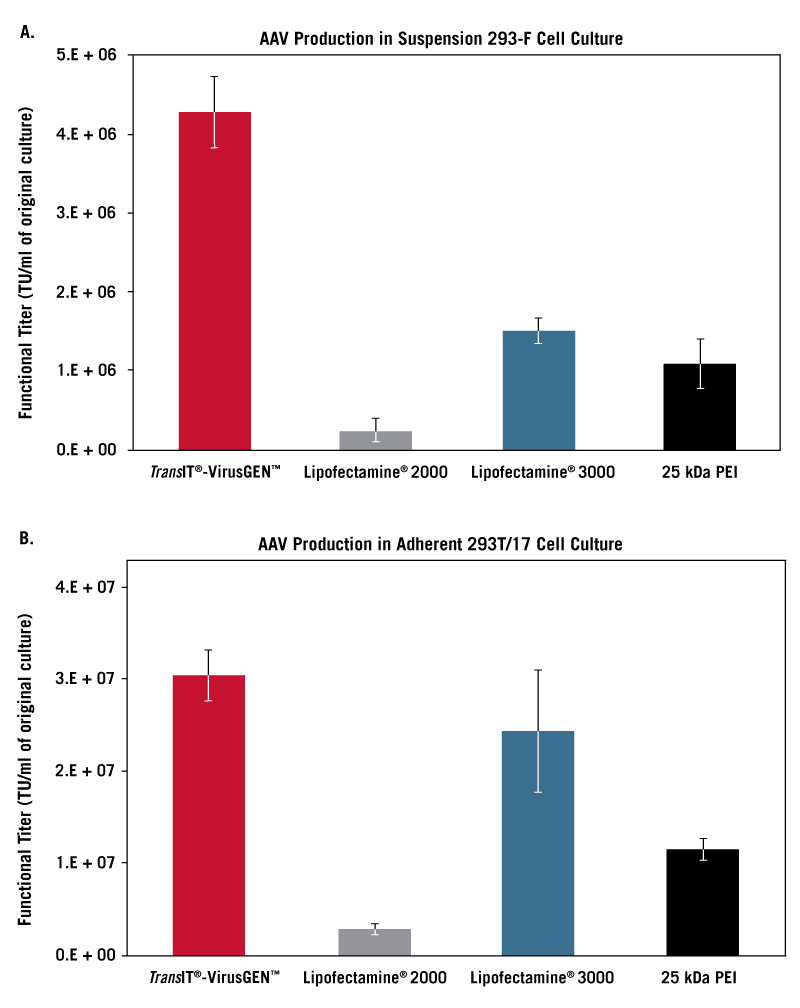 TransIT®-VirusGEN™ 在懸浮和粘附 AAV 細(xì)胞培養(yǎng)方面優(yōu)于競(jìng)爭(zhēng)對(duì)手試劑
