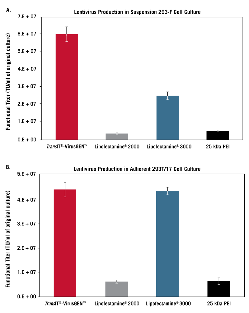 TransIT®-VirusGEN™ 在懸浮和粘附慢病毒細(xì)胞培養(yǎng)方面優(yōu)于競(jìng)爭(zhēng)對(duì)手試劑