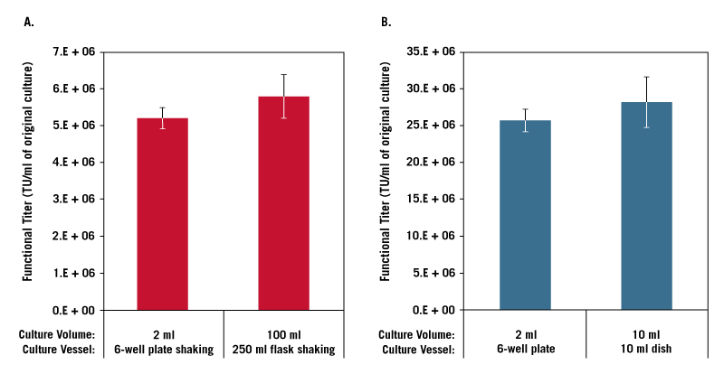 使用 TransIT®-VirusGEN™(2:1 試劑與 DNA 的比例(體積重量比),Mirus) ,使用指定的體積和培養(yǎng)容器,用 pAAV-hrGFP,pAAV-RC 和 pAAV-Helper(1:1:1 比例,1.5 總 μg/ ml,安捷倫科技)轉(zhuǎn)染在 FreeStyle™ F17 培養(yǎng)基 (A) 或粘附的 293T/17 細(xì)胞 (A) 中生長(zhǎng)的懸浮 FreeStyle™ 293-F 細(xì)胞。將收獲的病毒用于轉(zhuǎn)導(dǎo) HT1080 細(xì)胞,并通過(guò)流式細(xì)胞術(shù)測(cè)量 48 小時(shí)的 GFP 表達(dá)。從具有少于 20%GFP 陽(yáng)性細(xì)胞的病毒稀釋液測(cè)量功能滴度。誤差條表示一式三份孔、燒瓶或培養(yǎng)皿的標(biāo)準(zhǔn)偏差。